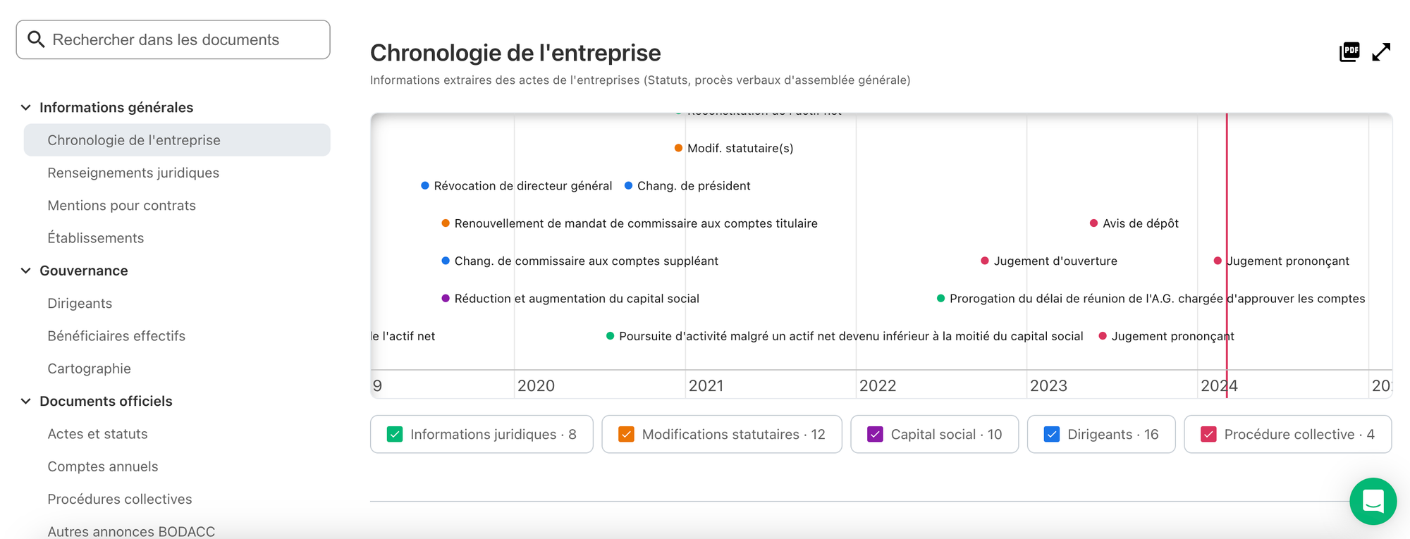 La frise chronologique pour s’imprégner très rapidement de l’historique de l’entreprise et accéder en 1 clic à ses évènements les plus intéressants pour votre analyse.