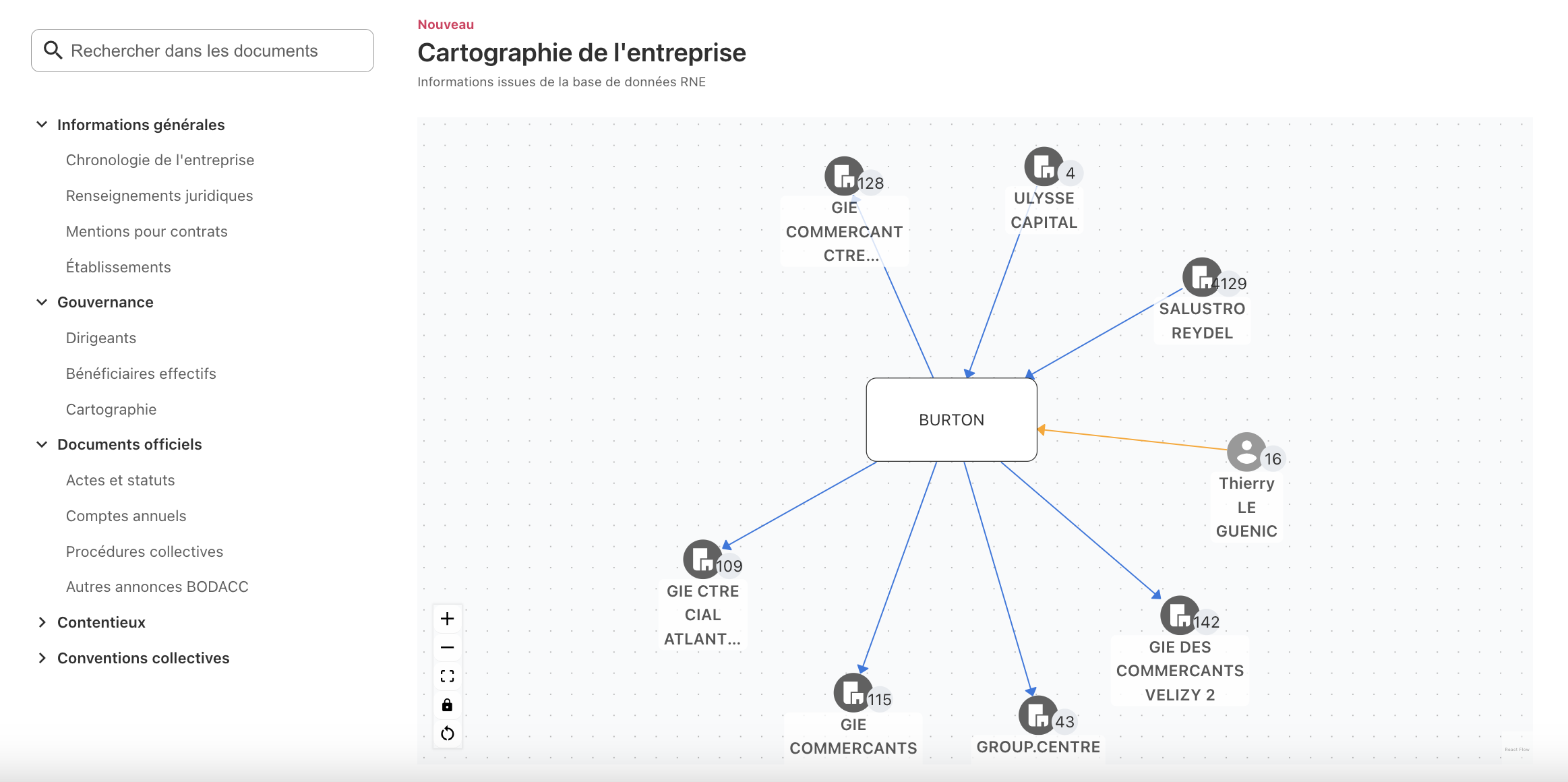 La cartographie pour comprendre en un coup d’oeil le réseau d’affaires qui gravite autour de l’entreprise (dirigeants, bénéficiaires effectifs, personnes morales).