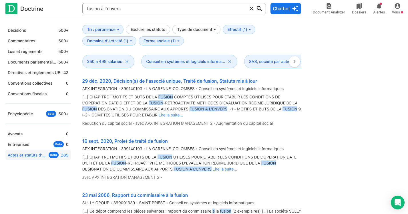 Doctrine vous permet de rechercher dans l’intégralité des actes de l’intégralité des entreprises françaises, pour mettre tout de suite la main sur les actes et statuts pertinents pour votre dossier.