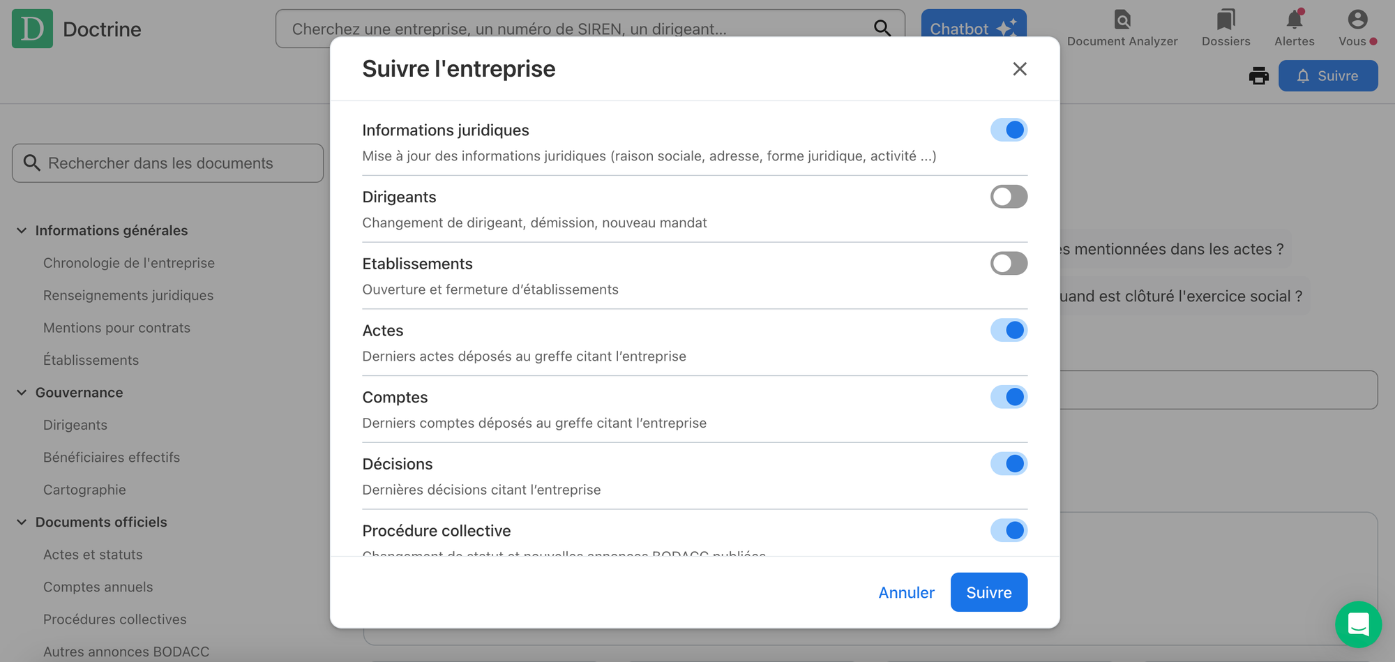 Placez sous surveillance les entreprises qui vous intéressent et sélectionnez la typologie d’informations que vous souhaitez recevoir dès qu’elles sont publiées.