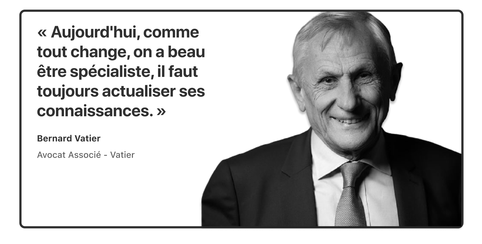Bernard Vatier le reconnaît, avec toute l'humilité d'un bon professionnel du droit : "Comme tout change, on a beau être spécialiste, on doit en permanence actualiser ses connaissances". Votre expertise est susceptible d'être challengée tous les jours, vous devez en permanence vous assurer que votre analyse est à jour.
