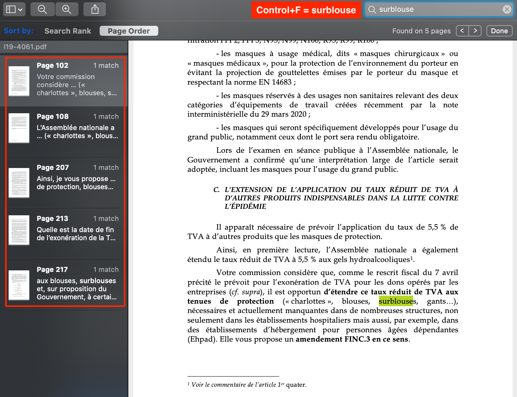 Dernier point, et non des moindres, il n'existe aujourd'hui aucun moyen de chercher, à partir d'une unique barre de recherche, parmi l'ensemble des documents parlementaires en France. Vous êtes encore et toujours contraint à faire des control+F à répétition et à ouvrir des dizaines d'onglets en parallèle.