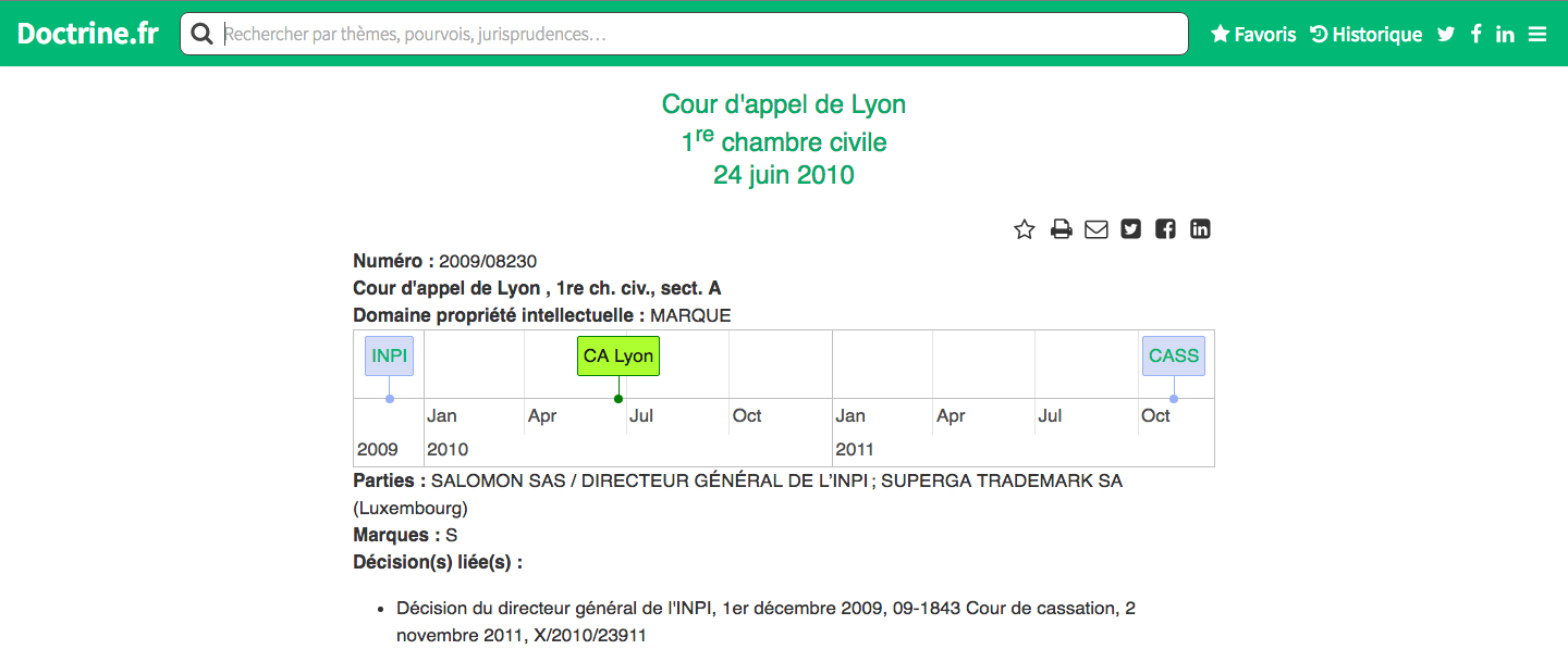 Doctrine associe aux décisions de justice une frise chronologique retraçant l’historique du contentieux de la première instance à la cassation. Il est précisé si les décisions de première instance ou d’appel ont fait l’objet d’une cassation ou d’une annulation.