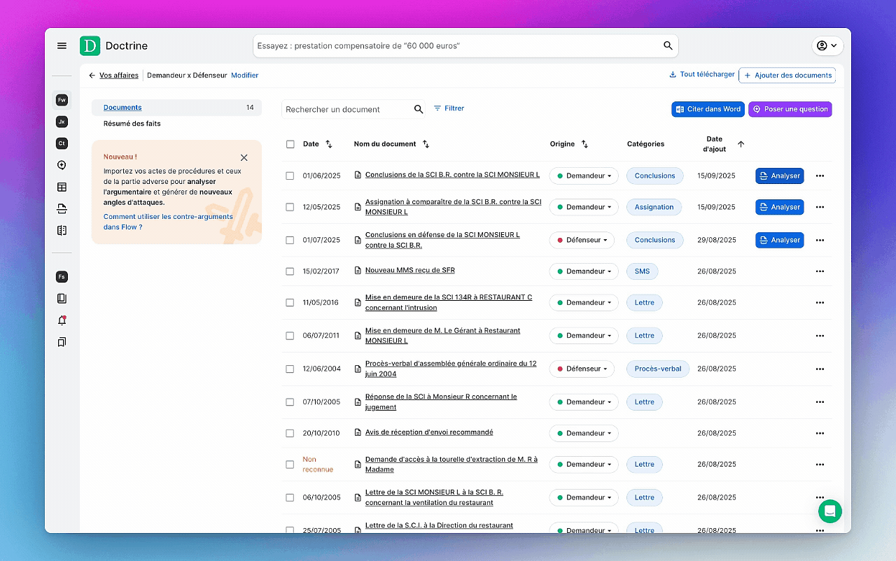 Avec sa nouvelle fonctionnalité Contre-arguments, Flow Litigate ne se contente plus d’administrer vos dossiers. Il vous accompagne désormais dans la stratégie. Il sait repérer les arguments clés d’un document, tester la solidité d’un raisonnement et suggérer des angles d’attaque appuyés sur la jurisprudence et les textes de loi.