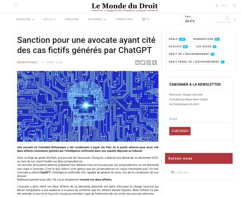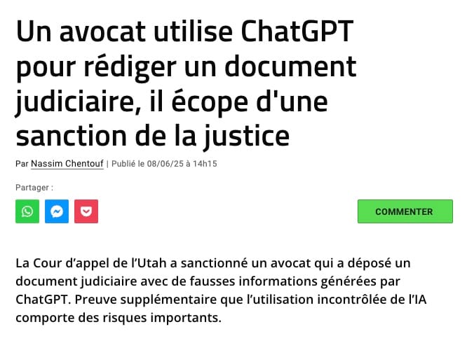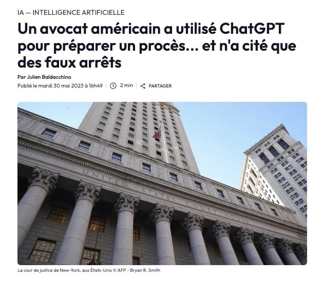 Elles peuvent donc générer des réponses très convaincantes, bien tournées, et pourtant totalement inexactes. On parle ici d’hallucinations juridiques : articles de loi inventés, arrêts qui n’existent pas, confusions sur des principes fondamentaux. Plusieurs affaires ont d’ailleurs défrayé la chronique, comme ce cas d’un avocat américain ayant cité six jurisprudences fictives générées par ChatGPT devant un juge.