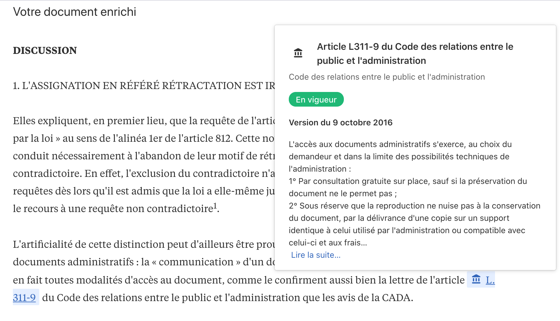 Vous accédez enfin à votre document enrichi de liens cliquables vers les décisions et règlements identifiés.