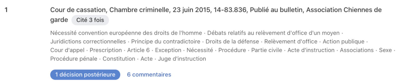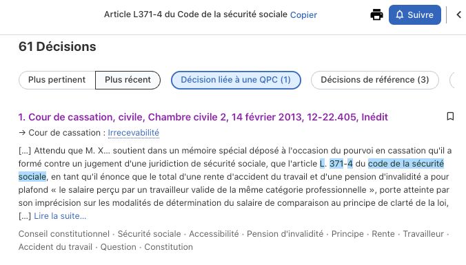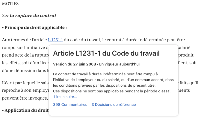 Le rôle de Doctrine est également de mettre en avant tous les contenus pertinents pour un document juridique. Ainsi à sur un seul article nous pouvons trouver :