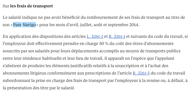 Une décision citant l’article du code du travail sur le remboursement des frais de transport, citant explicitement le Pass Navigo.