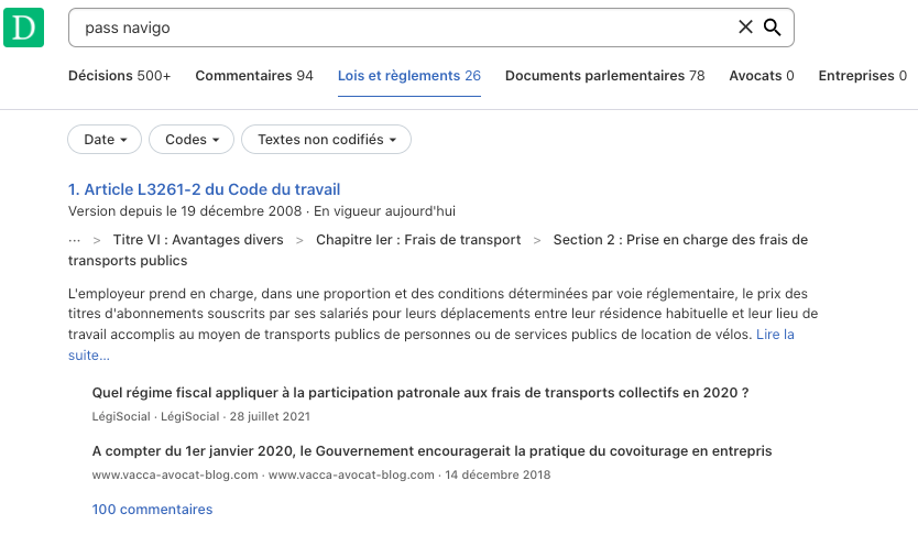 Le moteur de recherche Doctrine est pertinent sur la requête “Pass Navigo”.