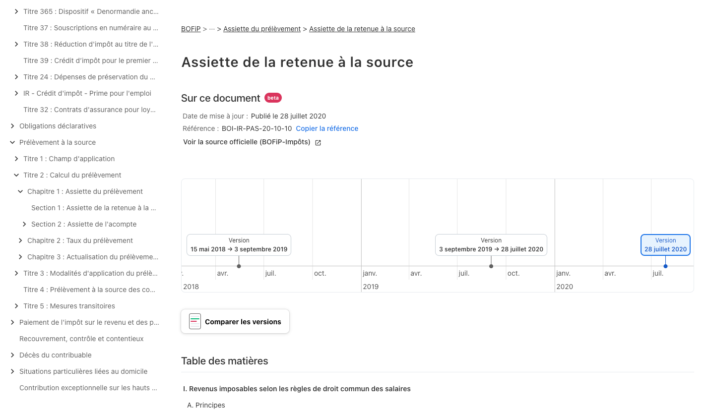 - Une navigation facilitée entre les différentes versions d’un BOFiP.