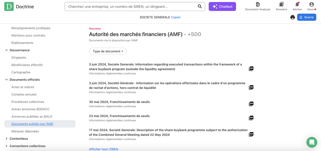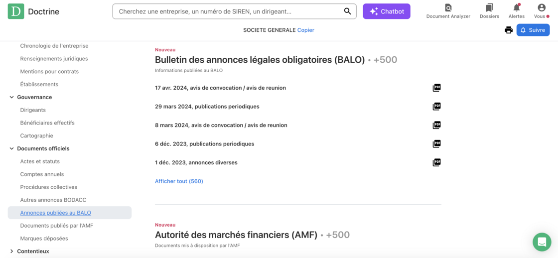 - Accédez à de nouveaux documents d’entreprise (BALO, AMF)