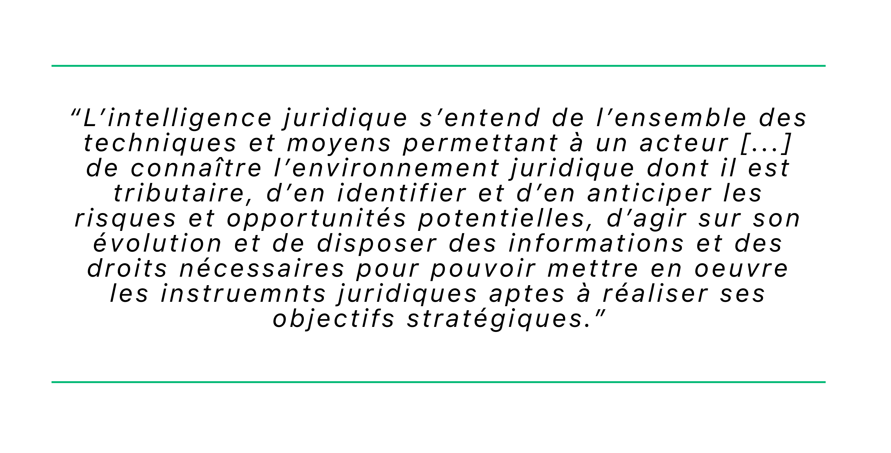 Selon lui, l'intelligence juridique s'entend de "l'ensemble des techniques et des moyens permettant à un acteur - privé ou public - de connaître l'environnement juridique dont il est tributaire, d'en identifier et d'en anticiper les risques et les opportunités potentielles, d'agir sur son évolution et de disposer des informations et des droits nécessaires pour pouvoir mettre en oeuvre les instruments juridiques aptes à réaliser ses objectifs stratégiques".