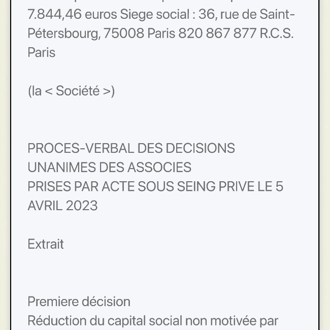 Doctrine IA condense pour vous chaque acte d’une entreprise en un résumé clair et exhaustif. Des résumés pas comme les autres puisqu’ils sont à la fois exhaustifs (ils citent l’intégralité des résolutions d’un PV d’AG par exemple), structurés (pour vous permettre de les lire facilement) et actionnables (ils mentionnent le type d’acte et les parties prenantes impliquées).