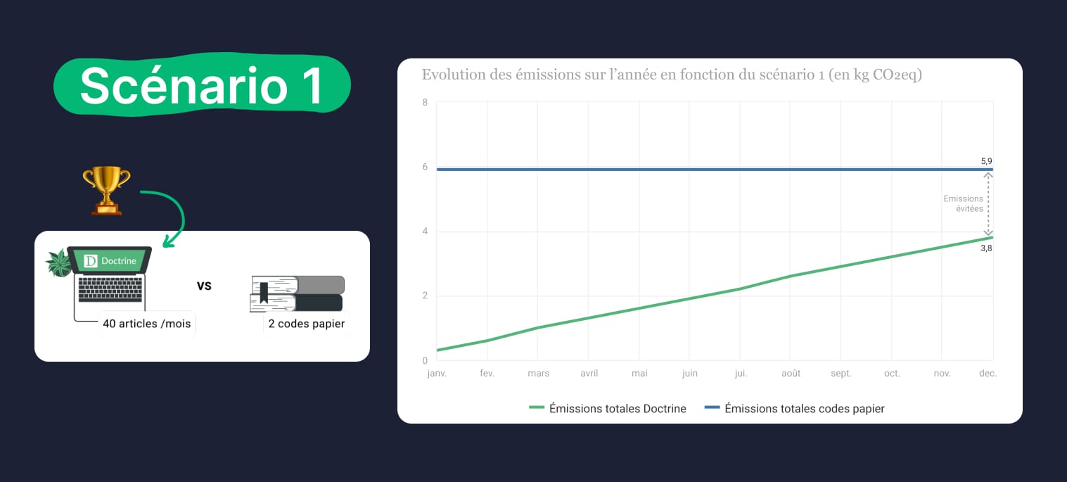 L’utilisation de Doctrine pour le scénario 1, contribue à éviter 2kg CO₂eq sur une année par rapport à l’utilisation de 2 Codes papiers soit l’équivalent de 31h de visionnage sur Netflix.