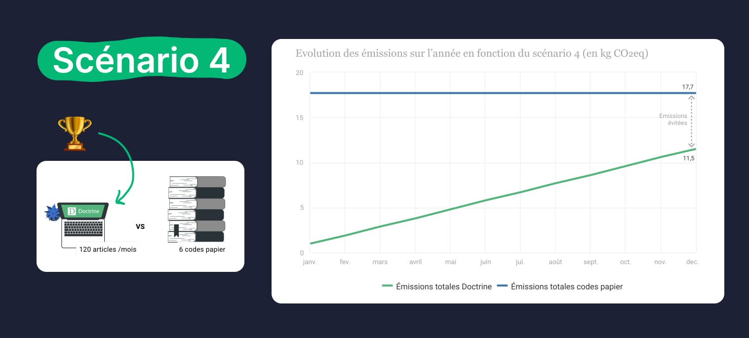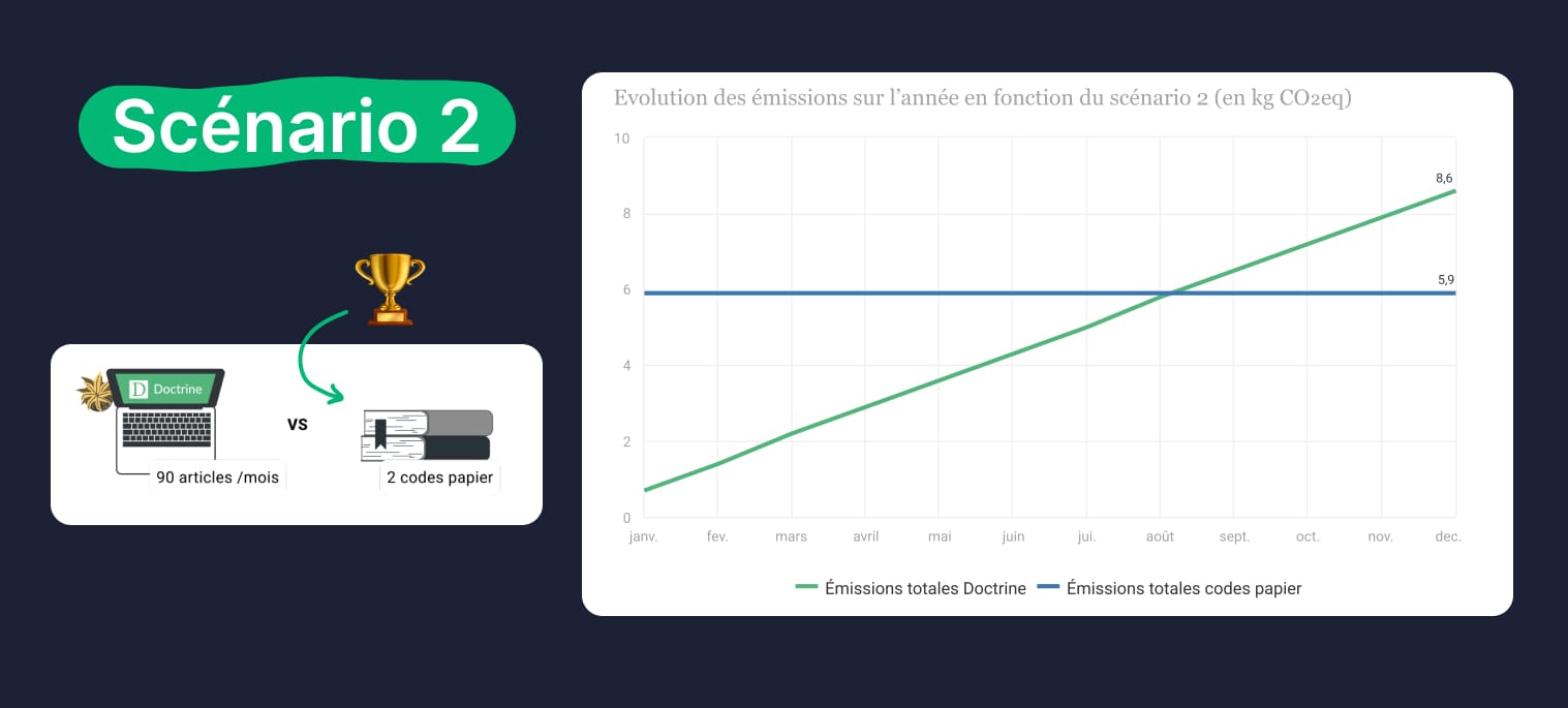 Pourquoi ce résultat ? Plus le nombre de consultations sur Doctrine augmente, plus les émissions de CO₂ augmentent elles aussi. Tandis que le Code papier, a toujours une valeur équivalente en émissions de CO₂.