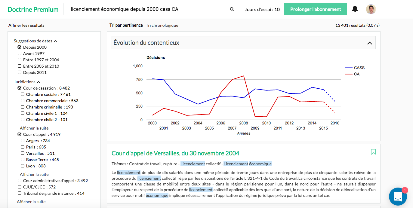 L’intelligence artificielle de Doctrine premium vous affiche l’évolution du contentieux pour votre recherche.