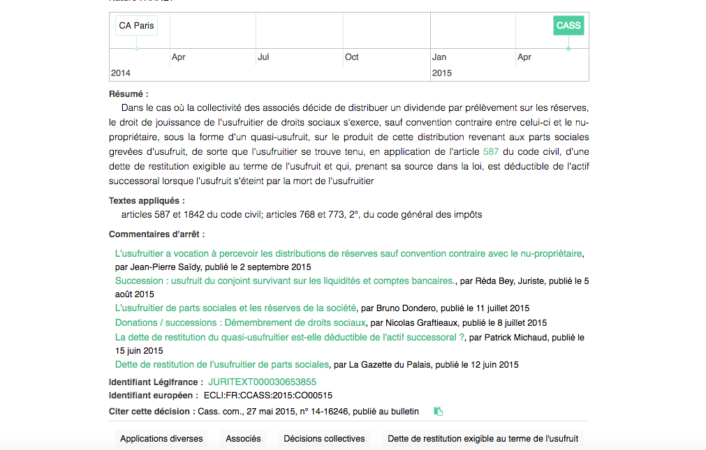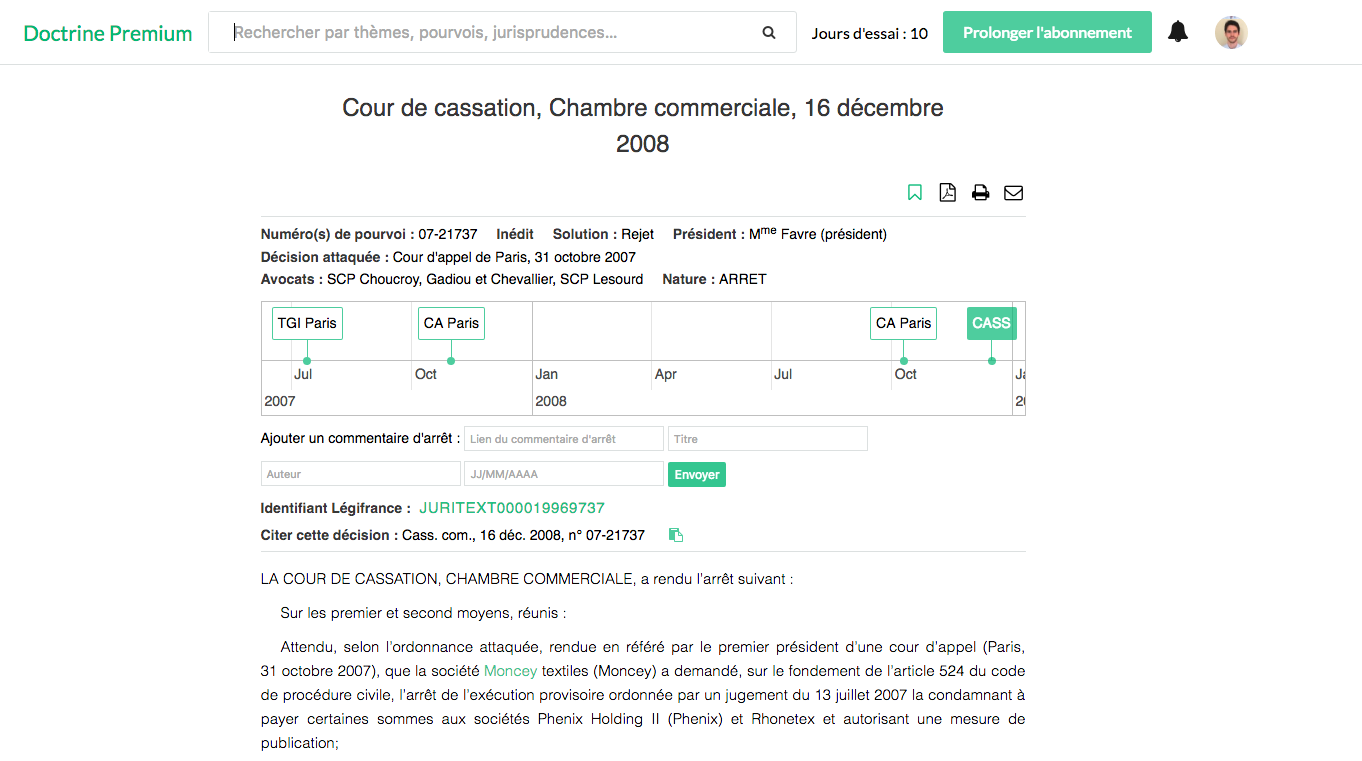 Quand vous consultez une décision sur Doctrine premium la frise chronologique permet de consulter en un clic les décisions de la première instance à la cassation.